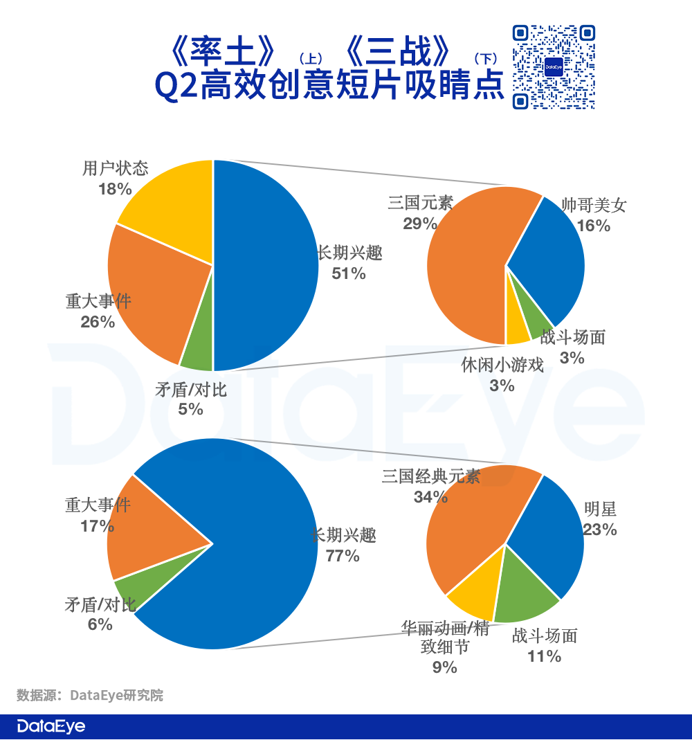 为了精准,【长期兴趣】原则中的三国元素,一直是三国类游戏的主要吸睛点,《三战》《率土》均是如此。但二季度,双方高效素材创意又都出现了一些其它方面的新变化。