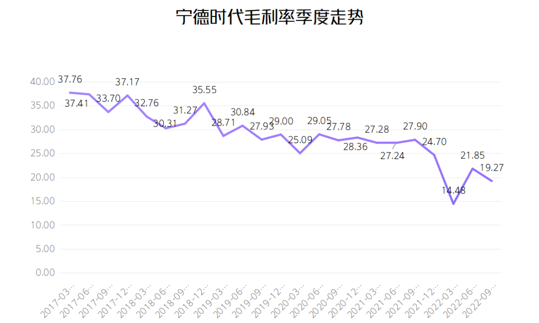 综合宁德时代季度趋势走向来看,亦是呈现逐年下降的态势。