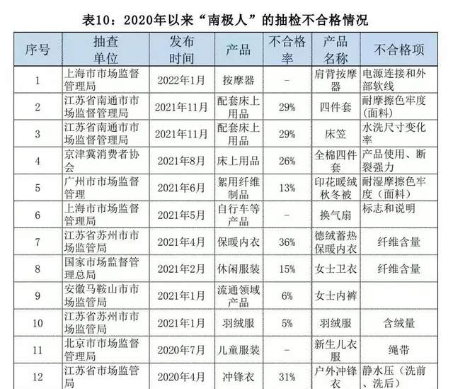 从2018年开始,南极人数十次登上国家质监部门及地方消费者协会的不合格产品黑名单,从蚕丝被、内衣、棉服等纺织品到电推剪、卷发器等家用电器,均有质量问题。