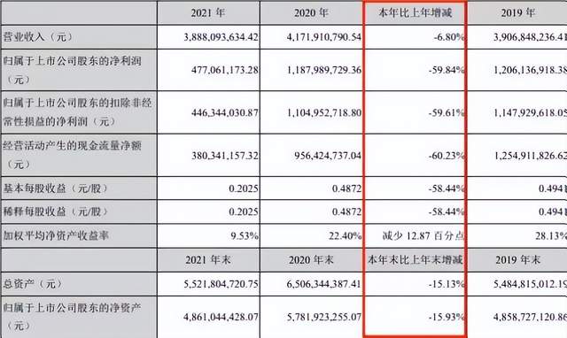 恶性循环下,自2020年11月开始,南极电商的股价就一路走跌,大股东频繁减持。今年4月,据南极电商发布的2021年度报告显示,去年公司营收为38.88亿元,同比下降6.8%,归母净利润为4.77亿元,同比下降59.84%,扣非净利润为4.46亿元,同比下降59.61%,生意越做越窄。