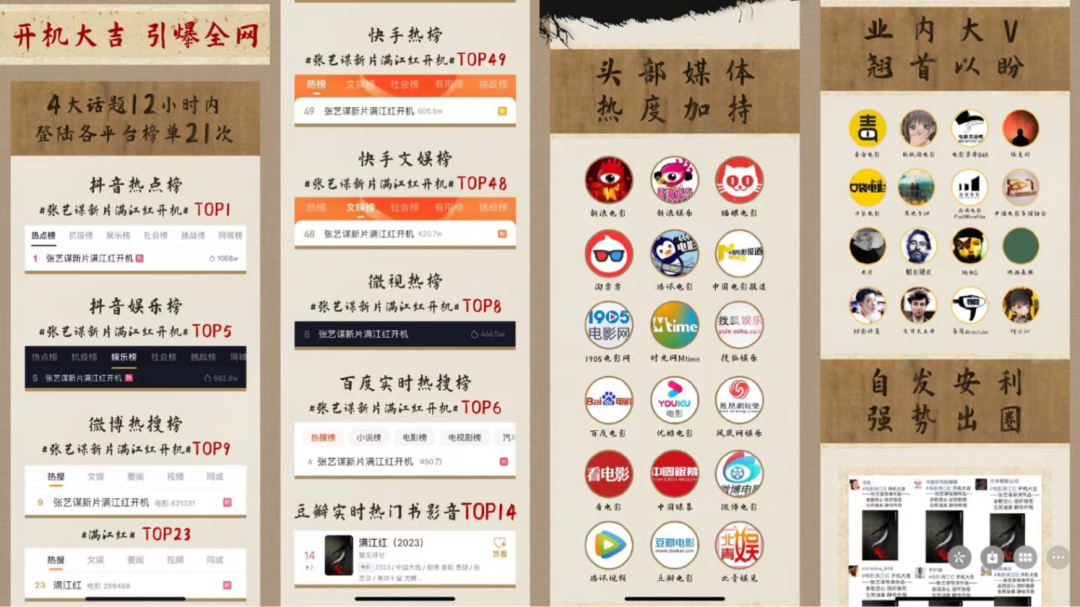 硬糖君也是头回见一部电影,只是开机就要发全网热搜战报。张艺谋新片《满江红》6月26日宣布开机,官博才过凌晨便迫不及待发布“引爆全网”的战报。这里面,不仅包含各平台热搜统计,还包含头部媒体、大V乃至网友自发安利图。