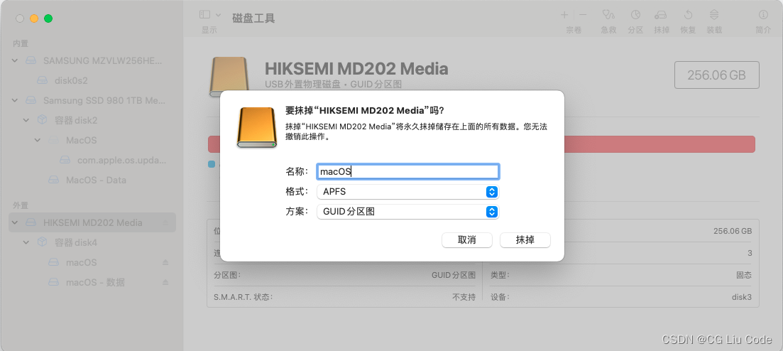 1.2选择新硬盘,点击抹掉,名称自己起(mac OS),文件格式(APFS)