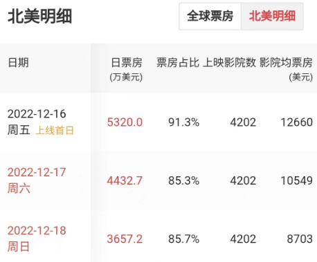 《阿凡达2》北美首周末票房表现