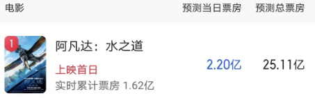 但在12月16日,政策的鼓励与观众的渴望并未实际转化为票房。《阿凡达2》的首映票房仅为1.26亿,这一数字远远低于业内预期。