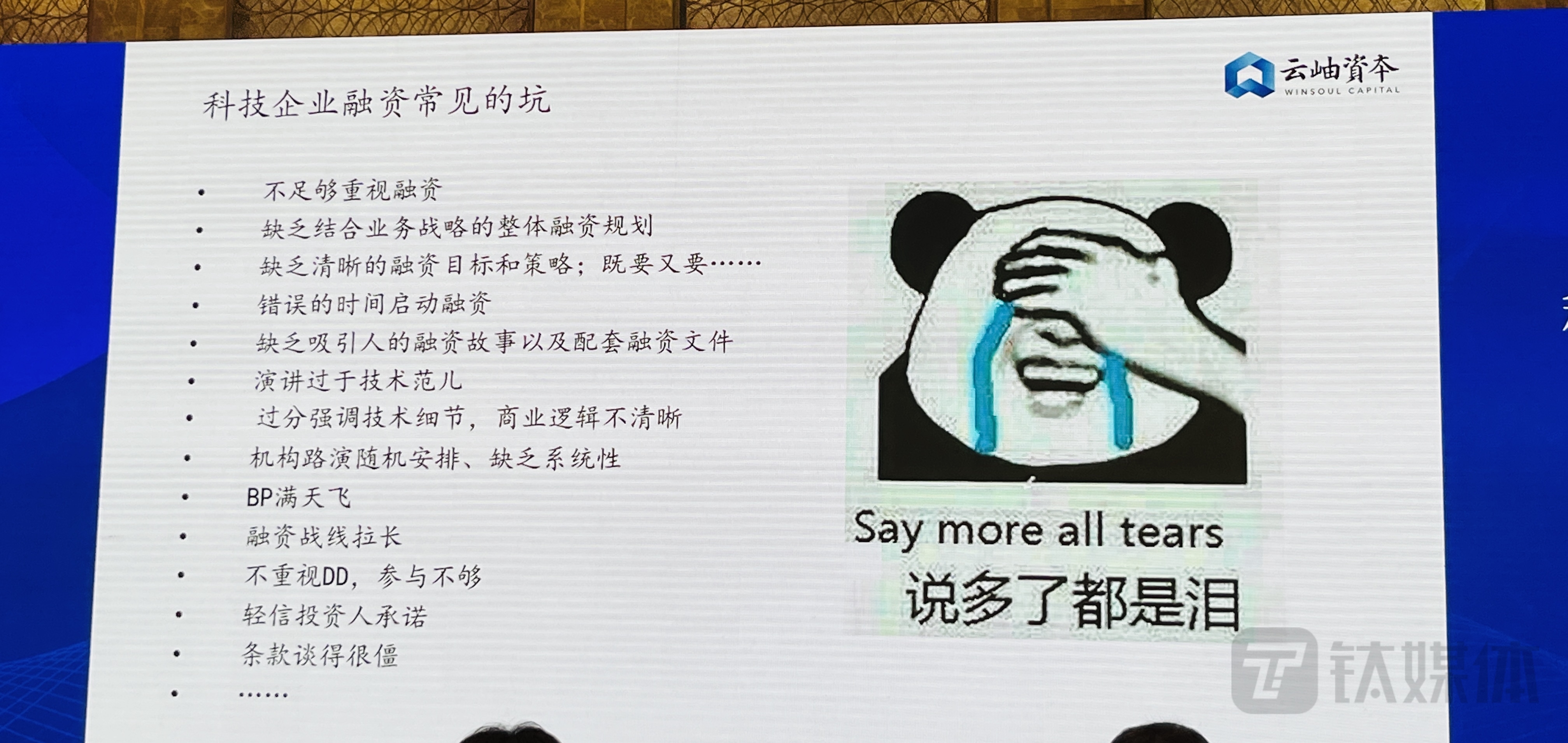 “科技企业融资中常见的坑:不够重视融资,创始人自己要来重视,不能说交给财务经理,因为投资人往往还是见到创始人本人,才愿意掏钱;缺乏结合业务战咯的整体融资规划;缺乏清晰的融资目标和策略;BP(商业企划书)满天飞;演讲过于技术范儿;轻信投资人承诺等等。”云岫资本合伙人兼CTO赵占祥在2022世界半导体大会上表示。