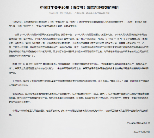 12月29日晚,红牛维他命饮料有限公司(下称“中国红牛”)发声明称,该公司收到深圳前海法院判决书,法院支持其全部诉请:1995年11月10日合资四方签订的50年合作《协议书》第一条有效。即“只有中国红牛有权在中国境内生产、销售红牛饮料。未经书面同意或许可,泰国天丝不得在中国境内生产或承包给其他公司生产或销售红牛饮料同类产品。”
