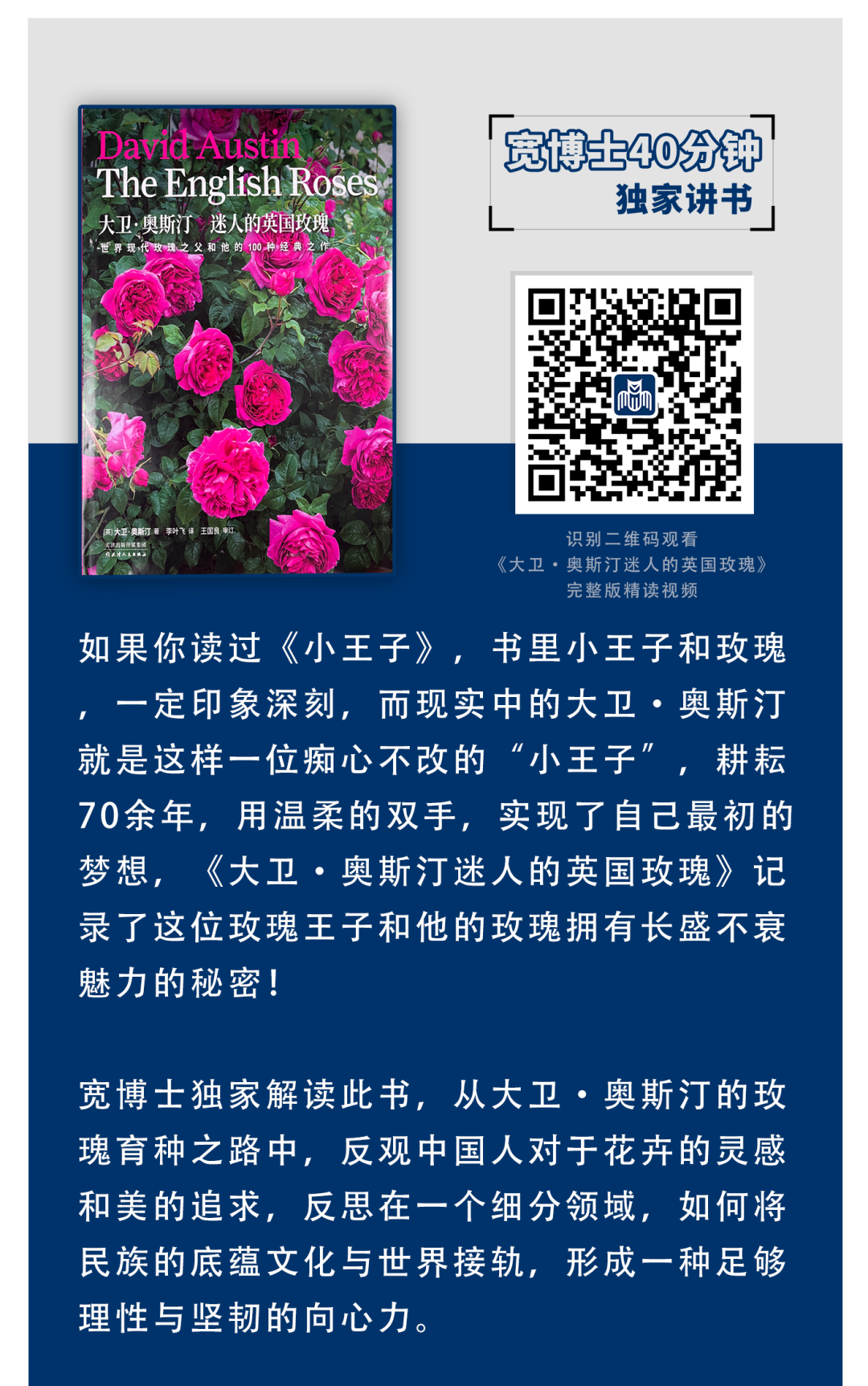 宽博士独家解读此书,从大卫·奥斯汀的玫瑰育种之路中,反观中国人对于花卉的灵感和美的追求也似乎从未停歇,然而在一个细分领域,如何将一个民族的底蕴文化与世界接轨,并形成一种足够理性与坚韧的向心力,将成为每一个美丽理想背后,人们探寻的一段路,也值得我们深思。