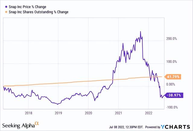 还值得强调的是这种现金消耗和高股票薪酬的影响,因为这导致了新股的持续发行。从 2017 年到 2022 年,流通股增加了约 42%,而 Snap 的股票下跌了约 39%。对于股东来说,这是一段痛苦的旅程。