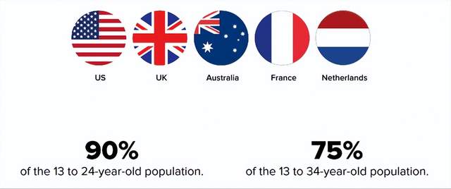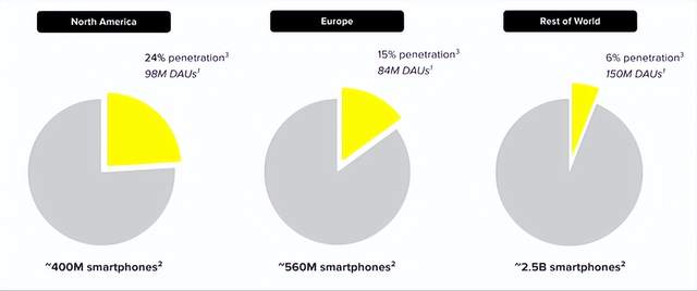 另外,Snap在 13-34 岁人口中具备高渗透率,但它在北美只有 24% 的智能手机普及率。