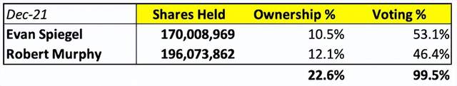 同时,Snap 的内部人持股比例非常高,Spiegel 和 Murphy 总共拥有公司约 22.6% 的股份。
