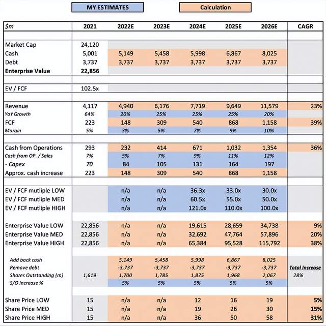 再假设自由现金流将保持正数,并且随着公司规模的扩大,利润率应该会继续扩大。且Snap继续稀释股东以资助公司的发展,在我的预测期内流通股增加了 28%。