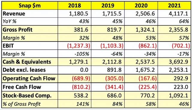 Snap 的财务状况很有趣。Snap 收入增长一直很出色,从 2018 年到 2021 年的复合年增长率约为 52%。然而,其他指标却并不理想。