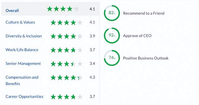 另一方面,通过浏览 Glassdoor了解公司文化,Snap 从员工留下的 612 条评论中获得了不错的分数。这个评分标准下,任何超过 4.0 的分数都令人印象深刻,而 Snap 在文化与价值观以及薪酬和福利方面的分数超过了这一分数。