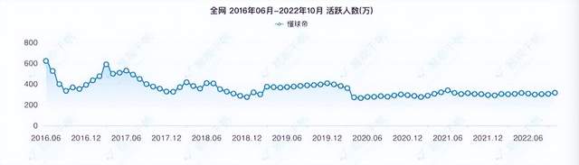 据易观千帆数据显示,懂球帝2022年10月的月活为315万;而上届世界杯举行的2018年6月,月活为408万;更早之前,2016年6月,其月活跃用户曾达到621万。虎扑自今年2月月活达到716万后,也一直在滑坡。