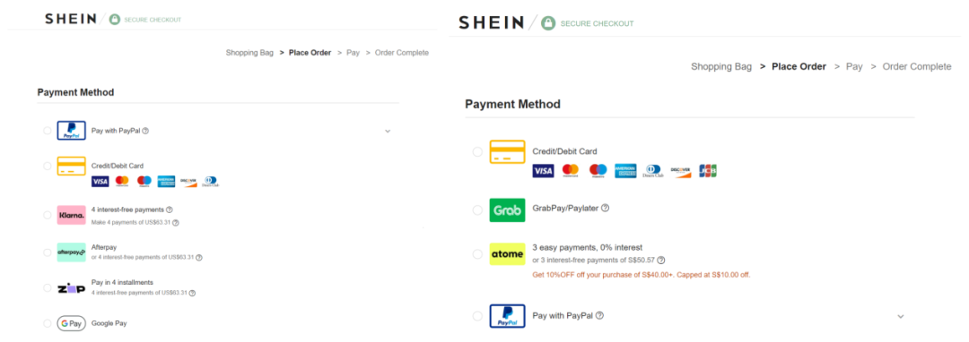 (图片来源:SHEIN官网付款页面截图,左图为美国站、右图为新加坡站)