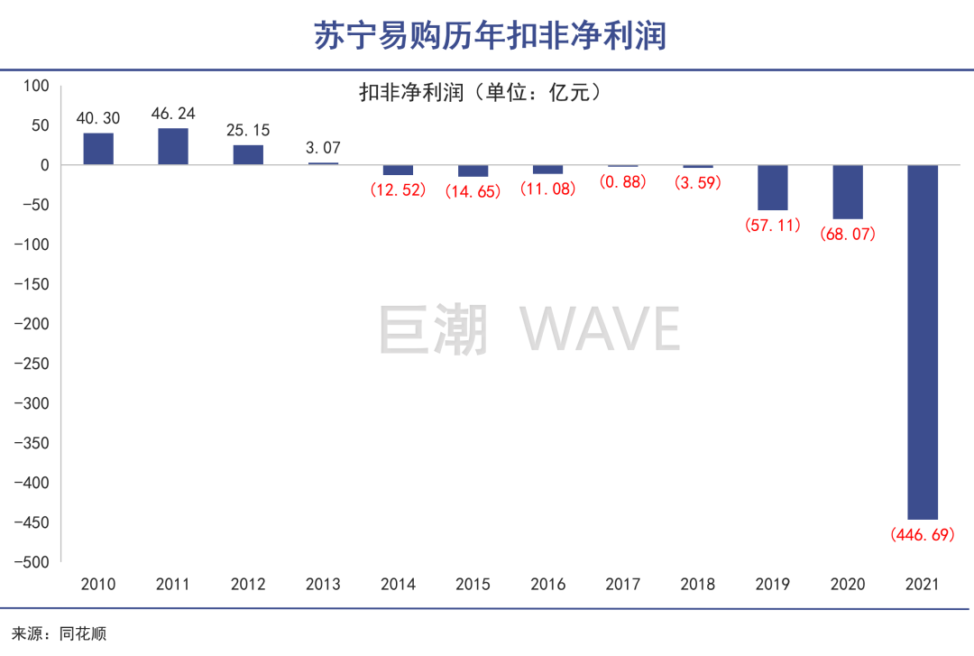 过去八年,苏宁易购扣非净利润持续亏损,合计高达615亿元,亏损数额是当前市值的整整3倍。也就是说,以股权价值衡量,要把苏宁易购卖掉三次才能弥补这些亏损。