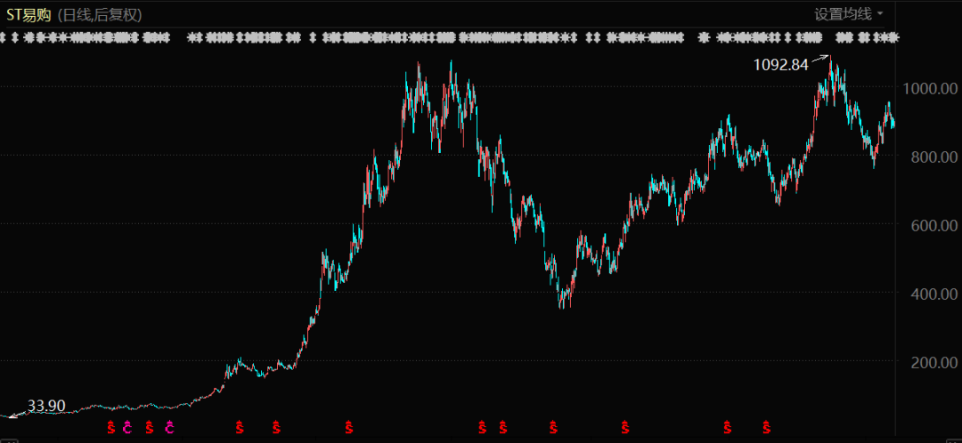 如果时间能够静止,苏宁易购的投资人希望是2015年。这一年的6月15日,其股价(后复权)上涨至1944元的历史最高峰,上市以来上涨了57倍,是中小板涨幅最大的上市公司。