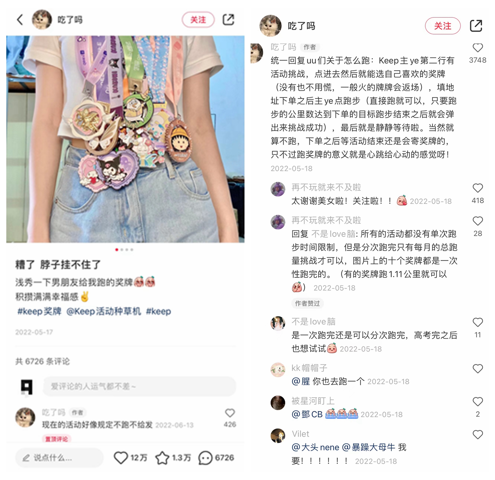 据海克财经观察,这种限时限量的方式越来越多地激起了用户兴趣,年轻用户甚至愿意将之作为“爱情礼物”。小红书用户“吃了吗”发布了自己挂着十余个Keep奖牌的图片,并配文字“浅秀一下男朋友给我跑的奖牌”,就收获了11.8万赞。在该笔记的评论区中,有无数用户圈出自己的另一半试图效仿。
