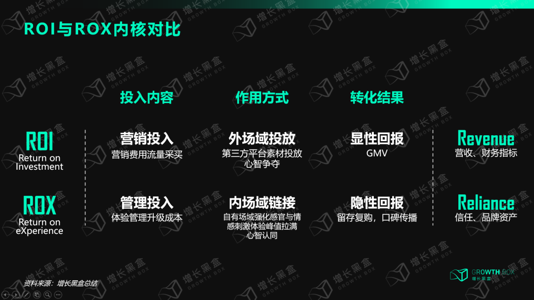 综合来看,增长黑盒认为,ROI指标是一个单聚焦在品牌营销投入与GMV****产出的财务指标;而ROX是一个更加注重用户情绪价值回馈的品牌指标。前者注重短期内营销投入的快速变现,后者更加注重用户资产的长期积累。