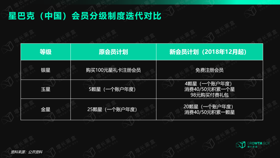 按照星巴克原会员计划,注册会员需购买100元星礼卡。2018年12月后,星巴克新版会员体系可免费注册成为会员,通过消费累计星星晋升会员。此举降低了会员注册的门槛,扩大了星巴克私域中可运营的会员基数,来达成“更多人”的目标。