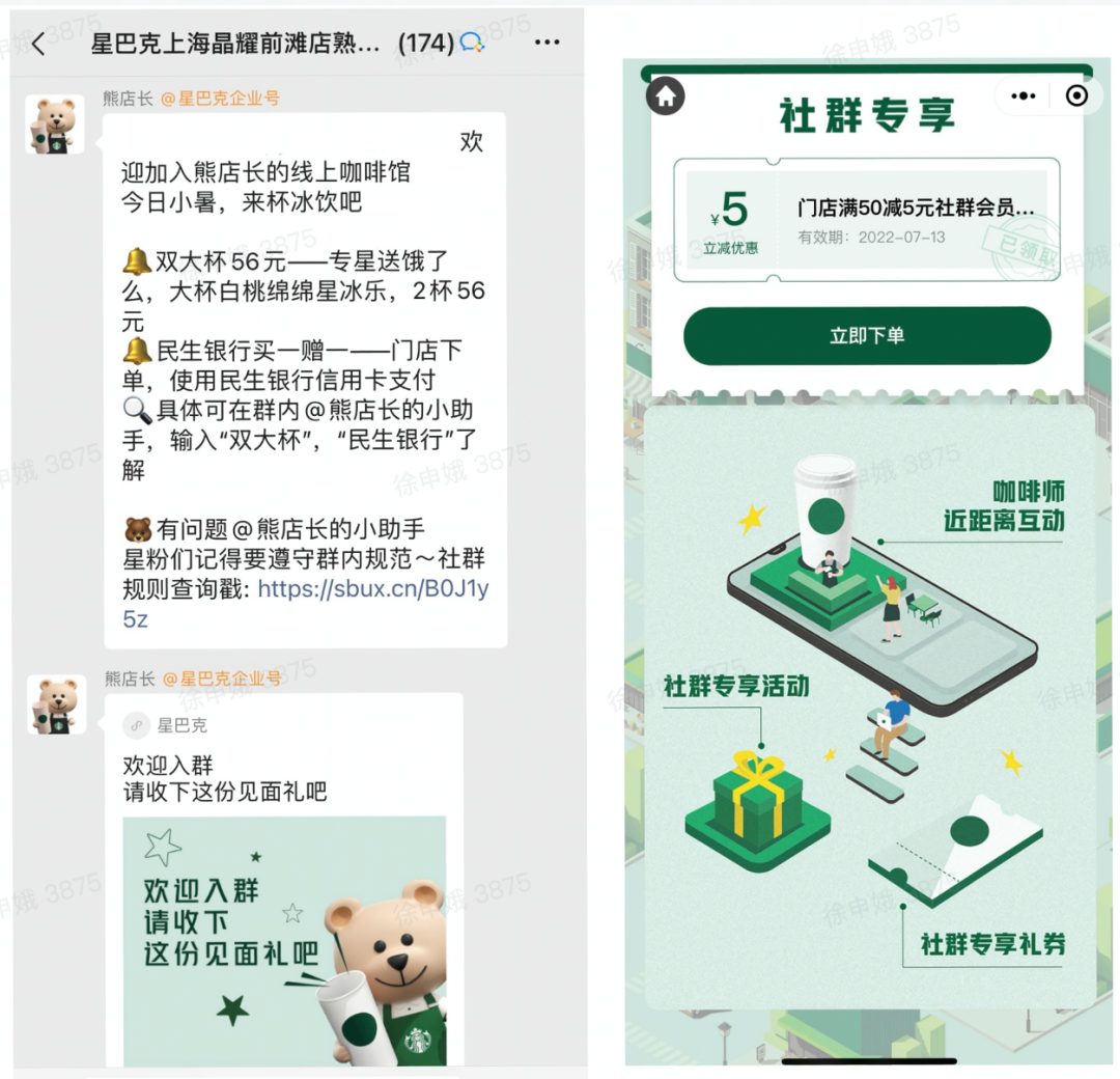 其次,为了激活会员存量,星巴克开始加重私域会员运营,以社区为单位建立深度互动。在这点上,星巴克以社区(门店)为单位,打造熟客群概念,吸引感兴趣的忠实用户入群。