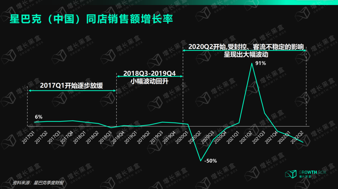 凭借着第三空间的战略定位,星巴克自1999年进入中国市场一路顺风顺水。但在2017年前后,由于中国咖啡市场竞争加剧,加上数字化时代消费环境发生了巨变,星巴克中国同店销售增长率开始逐步放缓。