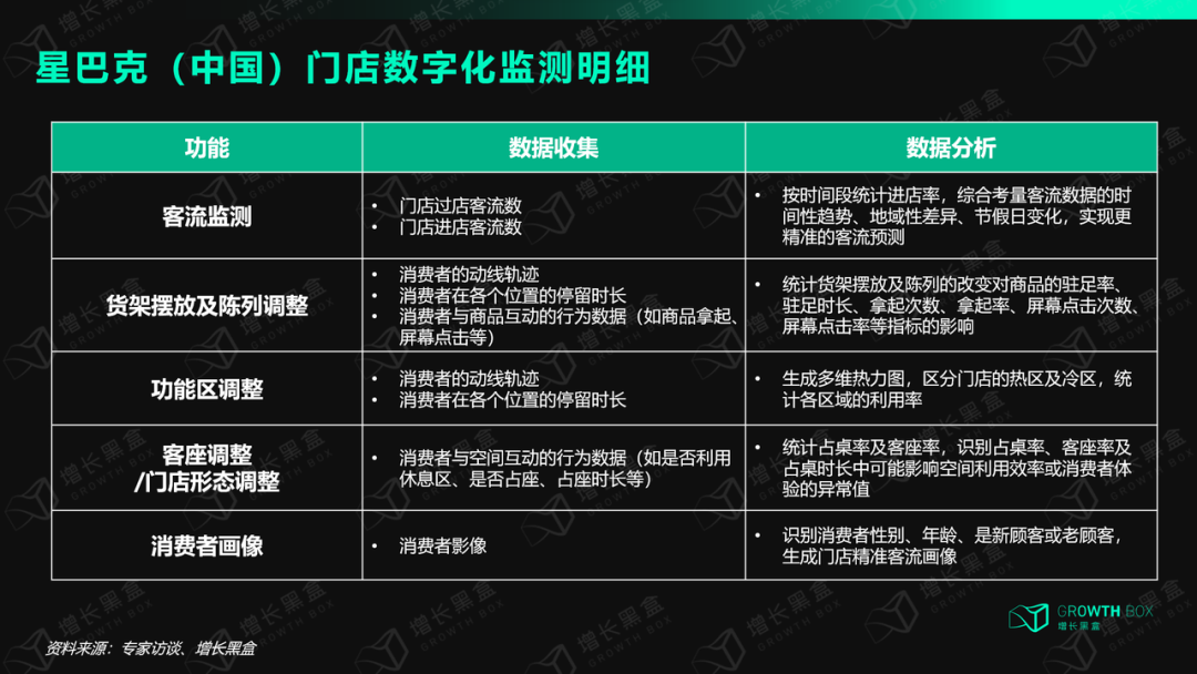 增长黑盒了解到,目前星巴克部分门店引入摄像头设备,采集客流、动线等不包含个人隐私的行为数据,从客流监测、货架摆放及陈列调整、功能区调整、客座调整/门店形态选择及消费者画像识别五个细分维度出发加以分析,同步提升了门店的空间体验和利用效率。