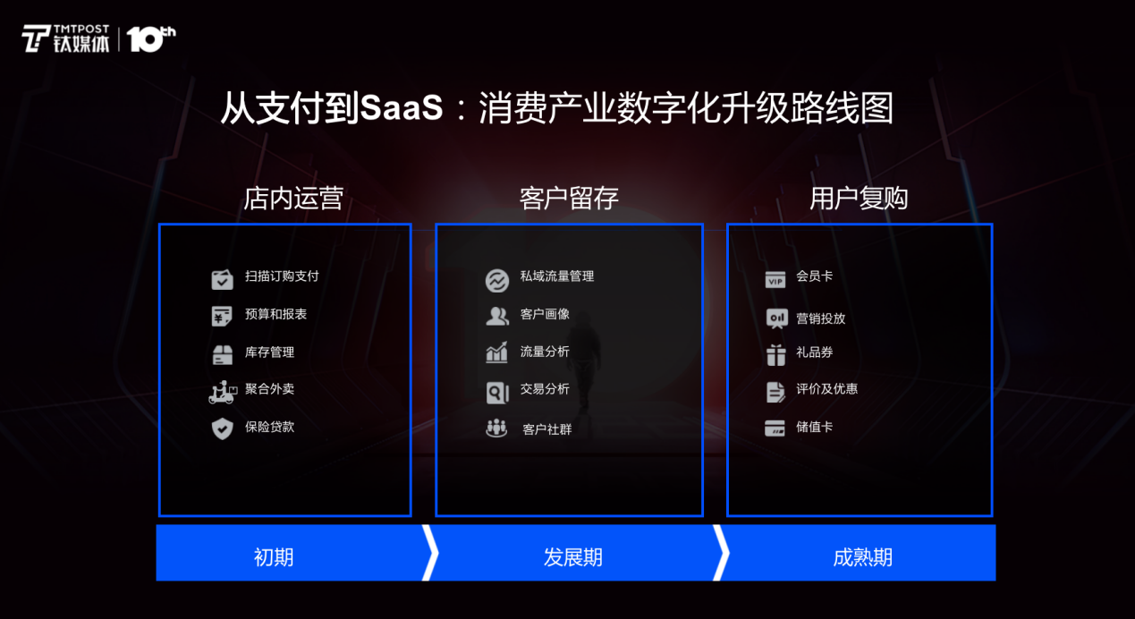 SaaS是一个很大的概念,但集中到线下消费产业,SaaS主要的产品是围绕商家的一个经营周期,从初期、发展期到成熟期,助其做店内运营、客户留存、用户复购,帮其提升整体经营效率。
