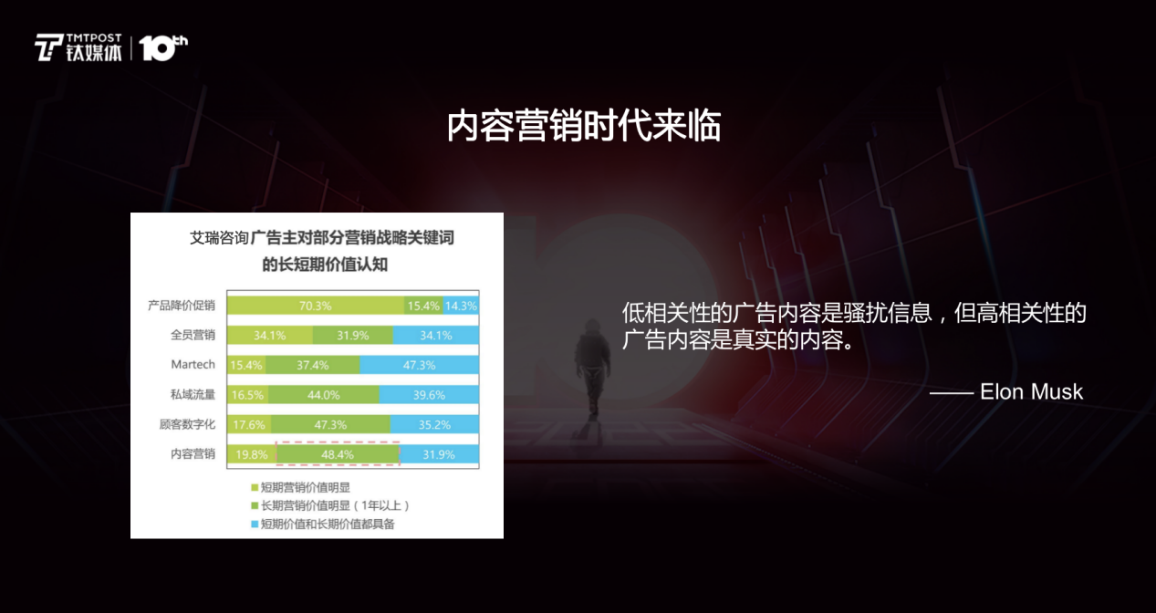 这个观点不是我们一家之言。比如,艾瑞咨询最近的一份调研就显示,广告主对内容营销的长期价值是最为认可的;同时,最近新收购Twitter的Elon Musk也提出,低相关性的广告是骚扰信息,但高相关性的广告则是真正的内容。这说明内容营销已经获得从商家到平台的广泛认可。
