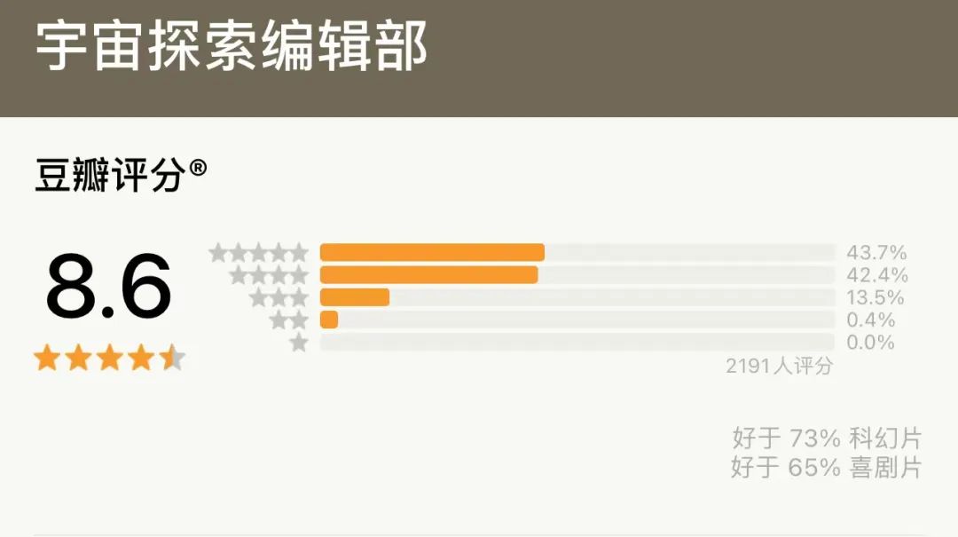 被称为“奖项收割机”的《宇宙探索编辑部》目前豆瓣评分已开,为8.6分,五星、四星合计占比超86%,零一星评价。