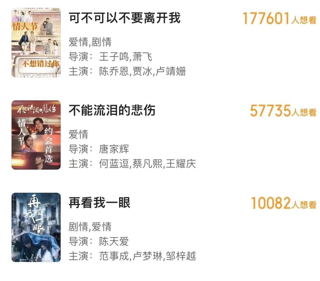 从猫眼想看人数切入,“情人节档”7部影片的最终竞争结果似乎已经清晰,陈乔恩、贾冰主演的《可不可以不要离开我》以超17万想看人数遥遥领先,处于TOP2的《不能流泪的悲伤》目前的想看人数还不足6万,而TOP3的《再看我一眼》刚刚破万。
