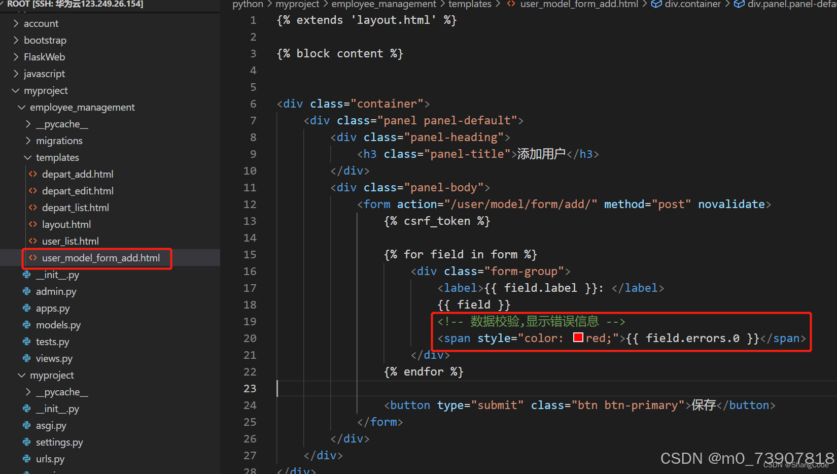 因为我们在/root/python/myproject/employee_management/templates/user_model_form_add.html中加入了{{ field.errors.0 }}字段