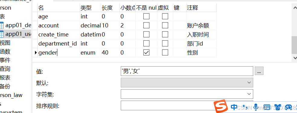 - enum在这里是限定sex这一个字段只能输入“男”或“女”