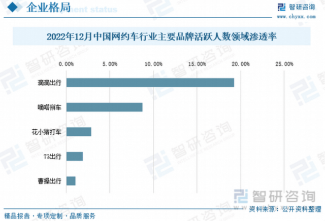 从市场占有率来看,美团打车也远远落后于其它平台,数据显示,2022年12月,滴滴出行活跃人数领域渗透率达19.27%,嘀嗒出行8.75%,花小猪打车2.89%,T3出行1.92%,曹操出行1.08%,美团打车(自营)的渗透率则不足1%。