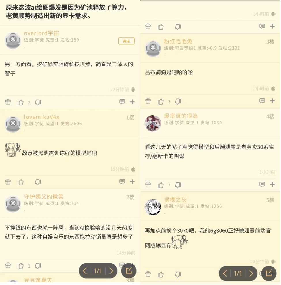 不得不说,这波浪潮的到来,和RTX 40系显卡的发布时间可谓完美契合,再加上老黄近日及时解锁的RTX 30系算力限制,难怪NGA论坛的用户都在讨论*:“怎么感觉矿潮之后,AI作画要成为新的显卡需求啊?难道这波作画模型泄露的受益者,真的是刚刚发布新显卡的老黄?”*