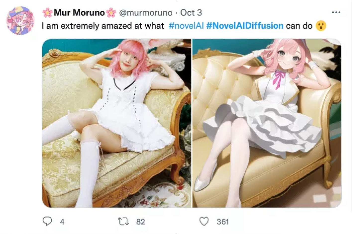 和过往的AI作画不同,NovelAI的入门方式简单(注册会员)、创作方式多样(文本生成、原画改写、简笔画生成)、出图素质较高(有充分训练的多个模型打底),最重要的是,符合二次元爱好者的取向,这也使得“AI作画”这个概念在本月迅速爆火。至于NovelAI非法爬虫P站稿件训练模型,或是网友利用草稿生成画作反诉作者这些争议事件,则都是后话了。
