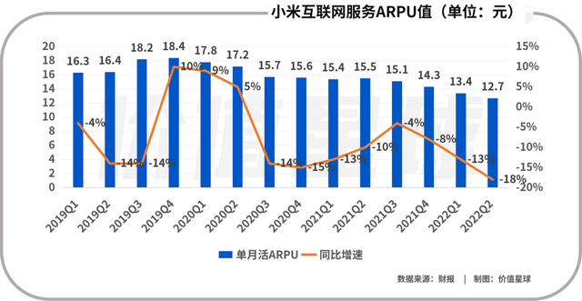 雪上加霜的是,这些新获得的用户似乎并不太愿意花钱。二季度小米互联网服务ARPU值为 12.7元,同比下滑18%。