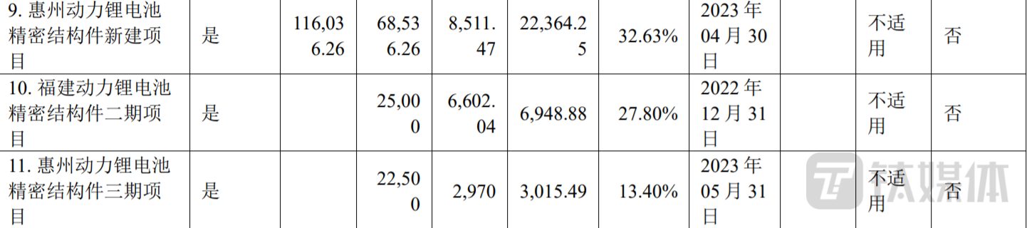 2022年中报显示,前一轮定增的三个项目中,计划2022年12月份达到可使用状态的“福建动力锂电池精密结构件二期项目”截至期末投资进度27.80% ;计划2023年4月、5月分别达到可使用状态的“惠州动力锂电池精密结构件新建项目”、“惠州动力锂电池精密结构件三期项目”实际投入资金占承诺投资金额的32.63%及13.4%。