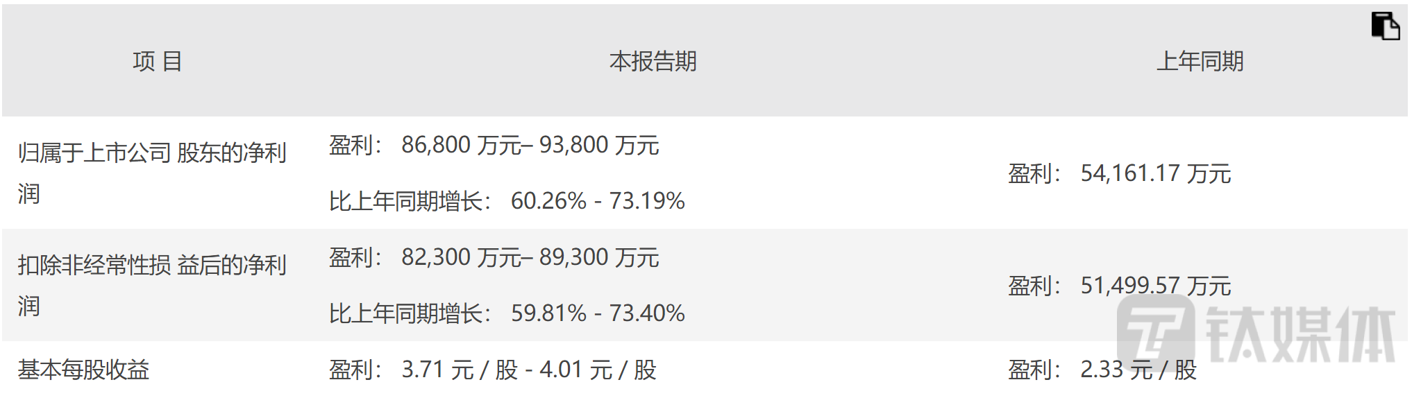公司业绩公告给出原因称,报告期内受益于新能源汽车行业快速发展,客户对公司动力电池精密结构件需求持续提升,公司动力电池精密结构件的产销量持续稳定增长,推动报告期内公司经营业绩实现较大幅度增长。