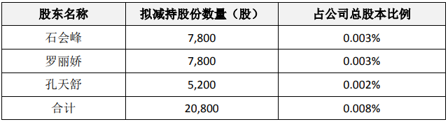 公告显示,科达利董事、财务总监、副总经理石会峰,公司董事会秘书、副总经理罗丽娇,公司副总经理孔天舒三人计划自公告之日起15个交易日后的6个月内,合计减持公司2.08万股。
