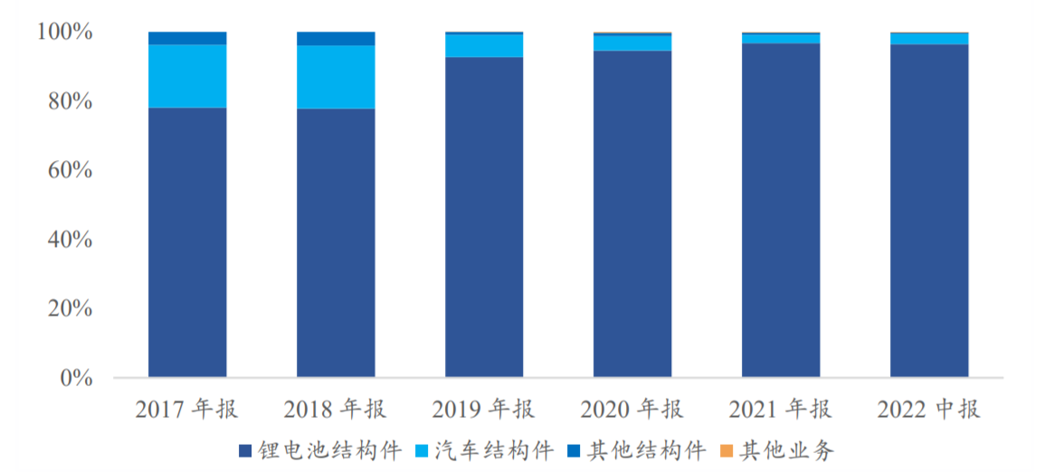 从科达利的业务结构可以看出,目前锂电结构件业务是科达利的绝对主业。截至 2022 年中,科达利锂电结构件业务收入达 32.69 亿元,占总收入比重已超过 96%。公司锂电池结构件、汽车结构件及其他结构件收入占比达 99.82%。