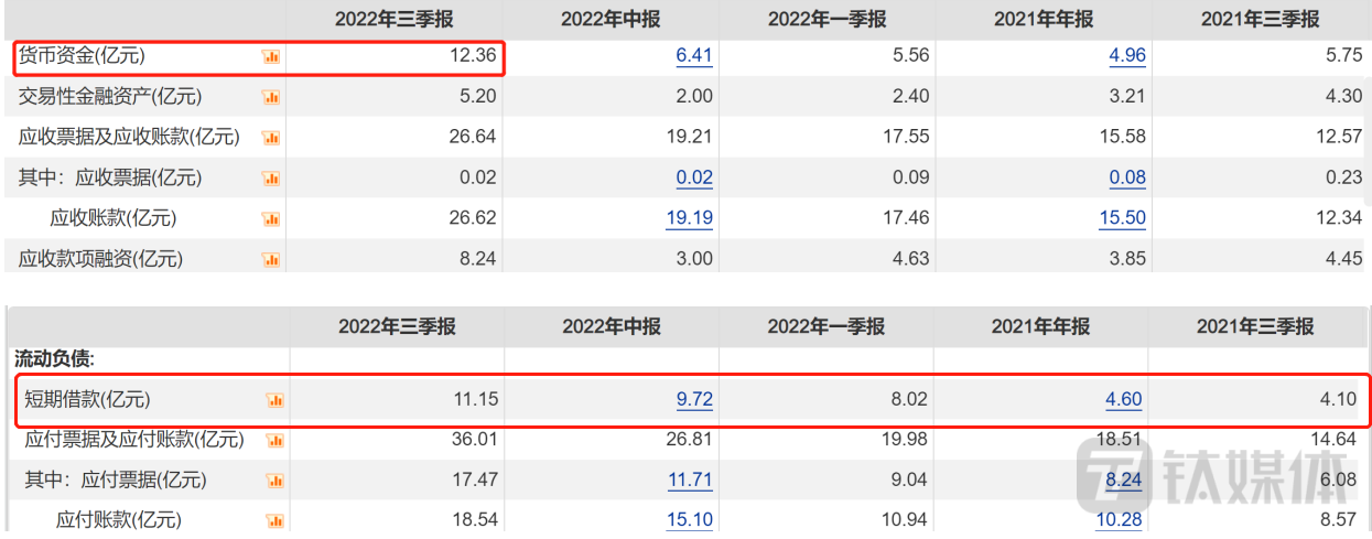 不过在这次36亿元定增融资之前,2022年7月科达利已经完成一轮15.34亿元的债权融资。虽然已经融到大量资金,但是从科达利的资产负债表可以看出,在高达15亿元的可转债融资过后,公司仍然很“缺钱”。截至2022年9月30日,公司账上货币资金余额12.36亿元,但短期借款高达11.15亿元,资产负债率由2021年年末的36.66%升至54.98%。