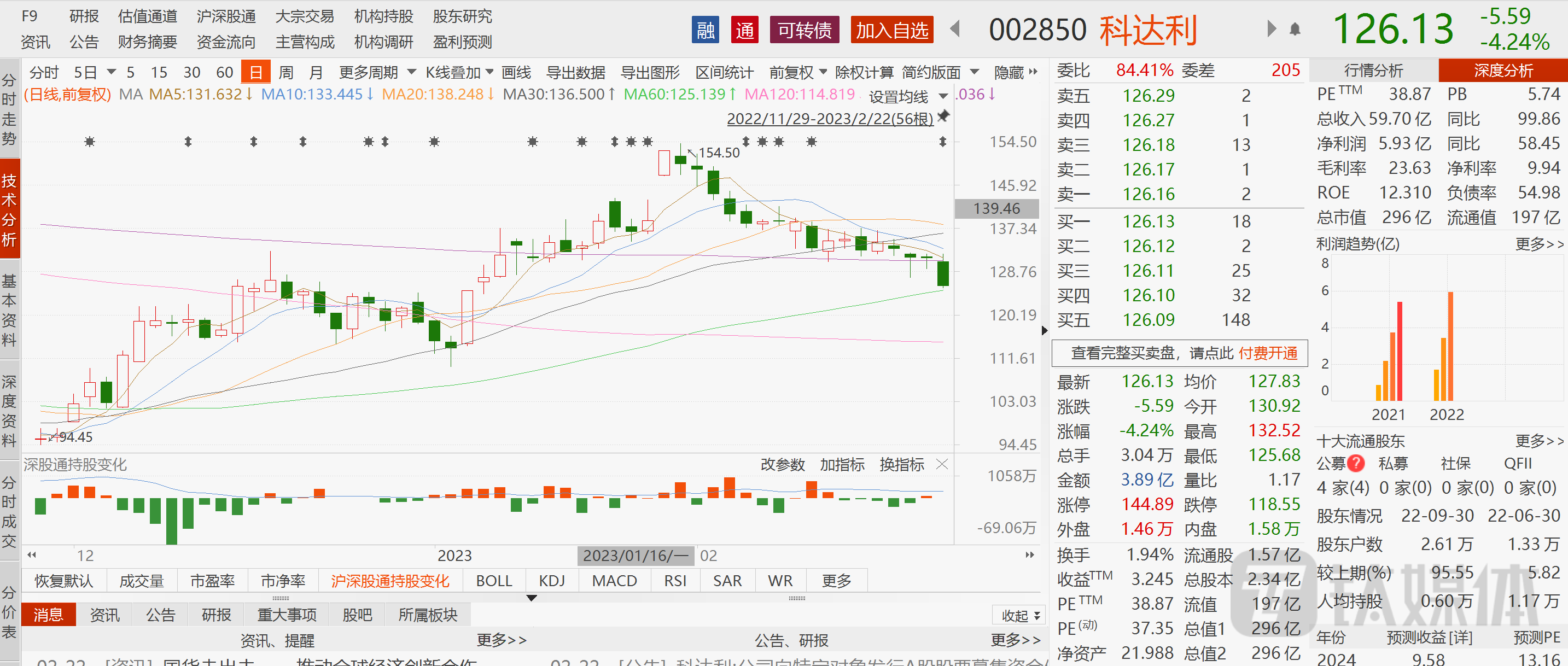 三份公告的发布实际上是对去年定增融资事宜的补充及说明,这或许意味着距离定增实施不远了。不过,消息出来后二级市场对此并不“感冒”,开盘后科达利直接下跌,截至2月22日收盘,科达利收跌4.24%,收报126.13元,总市值296亿元。