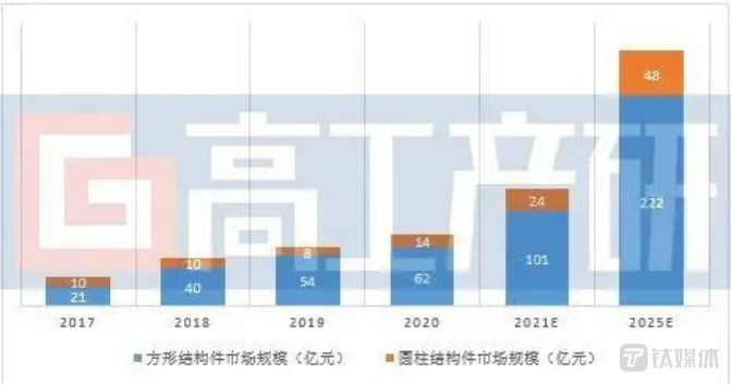 据悉,结构件是锂电池的重要组成部分,承担着保护电池内部的作用,是锂电池不可或缺的一部分。在新能源行业持续高景气的趋势下,结构件市场快速增长。GGII统计数据显示,2020年中国锂电池结构件市场规模为76亿元,同比增长22%。预计2025年中国结构件市场将达到270亿元,复合增速达到28.9%。