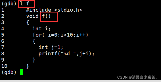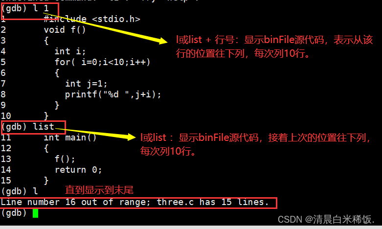 2、list/l 行号:显示binFile源代码,接着上次的位置往下列,每次列10行。