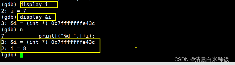 3、display 变量名:跟踪查看一个变量,每次停下来都显示它的值