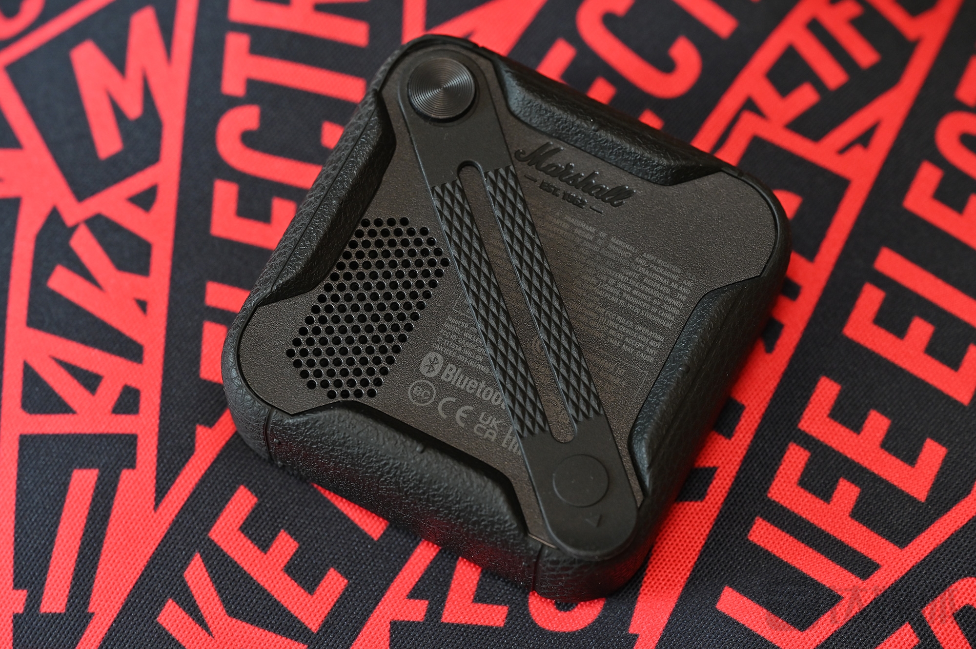 Marshall Willen体积尺寸为101.6×100.5 ×40.4mm,重量310g,看起来就像是平时使用的大号充电宝。方正,扁平的设计,也方便了日常随身携带。机身周围覆盖了硅胶材质,上面有荔枝纹图案起到防滑效果,支持IP67的防尘防水,对于野外游玩、露营使用,完全不用担心磕磕碰碰。