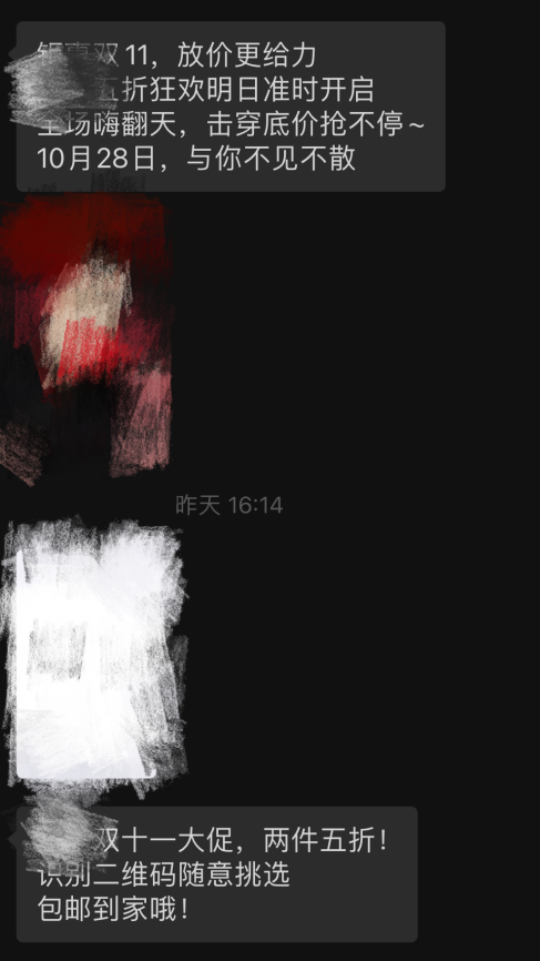“有时候看着就烦,一到双11就是铺天盖地的营销信息,淘宝京东我都关了通知提醒,但微信肯定是不能关的,结果现在品牌商家又在上面频繁给我发营销信息,烦的时候是真的挺烦的。”朋友阿文向「智能相对论」展示了他与某一个品牌销售的聊天截图,其中是对方多次私发给他的双11活动内容。在他看来,这种频繁的营销已经是一种打扰,为此在这期间他也删了不少过分营销的品牌商家微信。