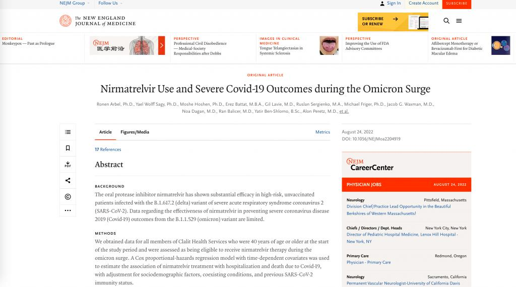2.Nirmatrelvir Use and Severe Covid-19 Outcomes during the Omicron Surge | NEJM